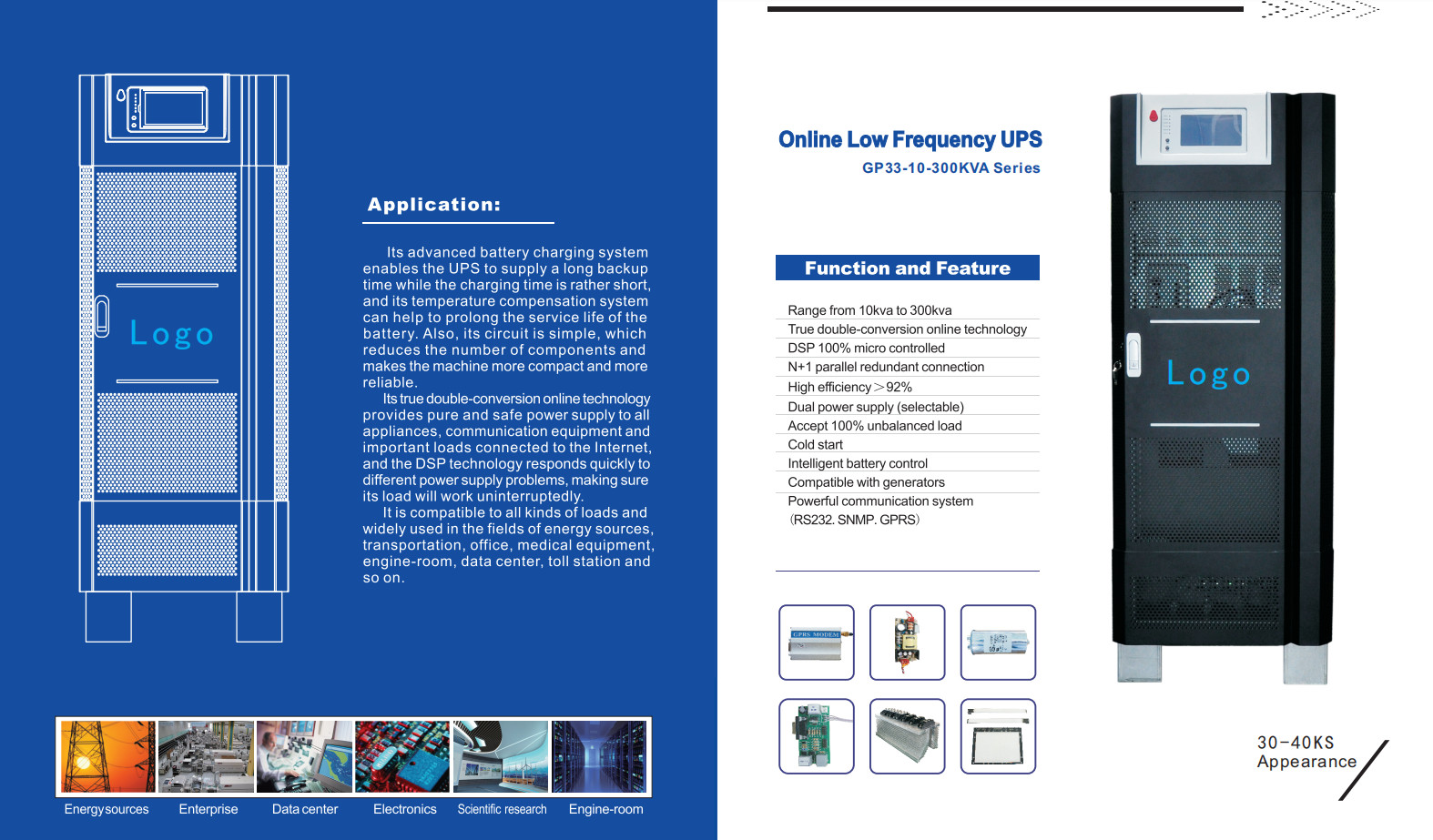 | La série GP33 est la double conversion en ligne UPS, avec les transistors bipolaires d'isolement de porte (IGBT) qui exécute l'excellente conversion de la sortie de sinewave de l'inverseur à haute fréquence de PWM. La série est applicalbe aux centres de traitement des données petits et moyens, le centre de gestion du réseau, salles des ordinateurs pour des entreprises, et capable fournir des solutions aux conditions comme la descente de tension ou le choc instantané, d'impulsion, de pulsation de tension, de tension de montée subite, d'harmonique, de déformation et de fréquence la fluctuation à haute tension d'atténuation, elle garantit à l'alimentation sûre et fiable d'offerr d'énergie pour toutes les charges aux utilisateurs. |